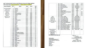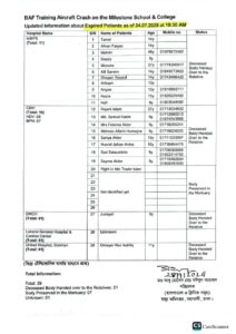 রাজধানীর উত্তরার মাইলস্টোন স্কুল অ্যান্ড কলেজে ক্যাম্পাসে ভয়াবহ বিমান বিধ্বস্তের ঘটনায় ঢাকার বিভিন্ন হাসপাতালে এখন পর্যন্ত ভর্তি রোগী ও নিহতদের সংখ্যা ও নামের তালিকা প্রকাশ করেছে সরকার।