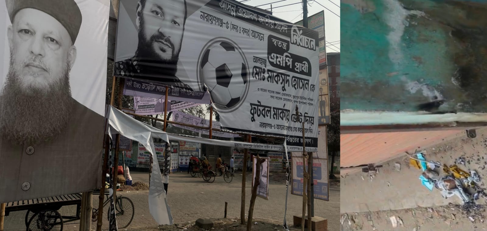 নিজস্ব সংবাদদাতা /// নারায়ণগঞ্জ বন্দরে রাতের আঁধারে স্বতন্ত্র সংসদ সদস্য প্রার্থী আলহাজ্ব মাকসুদ হোসেনের ফুটবল প্রতীকের ব্যানারে অগ্নিসংযোগ ও ফেস্টুন ছিঁড়ে ফেলার অভিযোগ উঠেছে। গত রবিবার রাতে নারায়ণগঞ্জ সিটি কর্পোরেশনের ২৩নং ওয়ার্ড বন্দর কদম রসুল কলেজ এলাকা থেকে নবীগঞ্জ পর্যন্ত এবং বন্দর উপজেলা কলাগাছিয়া ইউনিয়ন ২নং ওয়ার্ড আলীনগর নির্বাচনী এলাকার বিভিন্ন স্থানে টাঙানো ব্যানার ও ফেস্টুন ছিঁড়ে ফেলা হয়। এবং এর আগে ব্যানারে অগ্নিসংযোগের ঘটনাও ঘটে।