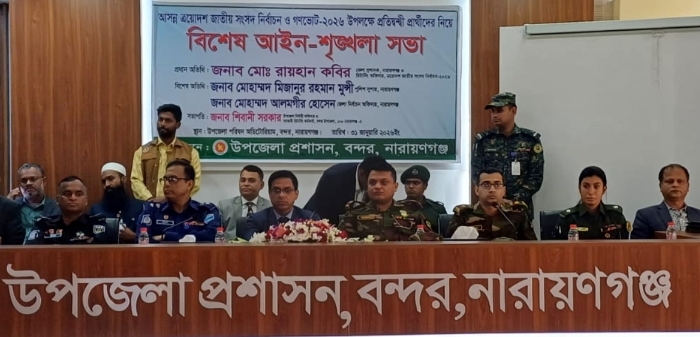 বন্দর প্রতিনিধি: আসন্ন ত্রয়োদশ জাতীয় সংসদ নির্বাচন ও গণভোট-২০২৬ইং উপলক্ষে বন্দর উপজেলা প্রশাসন আয়োজিত প্রতিদ্বন্দ্বী প্রার্থীদের নিয়ে বিশেষ আইন শৃঙ্খলা সভা অনুষ্ঠিত হয়েছে। শনিবার (৩১ জানুয়ারি) বেলা ১২টায় উপজেলা পরিষদ মিলনায়তনে এ সভা অনুষ্ঠিত হয়। আইন শৃঙ্খলা সভায় বন্দর উপজেলা নির্বাহী কর্মকর্তা ও সহকারী রিটার্নিং অফিসার শিবানী সরকারের সভাপতিত্বে প্রধান অতিথি হিসেবে উপস্থিত ছিলেন নারায়ণগঞ্জের জেলা প্রশাসক মোঃ রায়হান কবির। বিশেষ অতিথি হিসেবে ছিলেন নারায়ণগঞ্জের জেলা পুলিশ সুপার মোহাম্মদ মিজানুর রহমান মুন্সি ও জেলা নির্বাচন অফিসার মোহাম্মদ আলমগীর হোসেন।