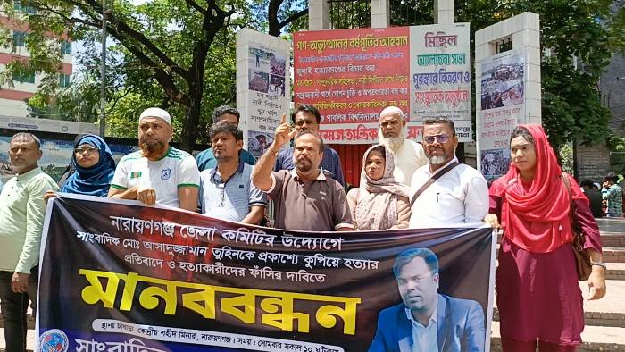 সাংবাদিক তুহিন হত্যা: সর্বোচ্চ শাস্তির দাবিতে সাংবাদিক সুরক্ষা কল্যান ফাউন্ডেশনের মানববন্ধন