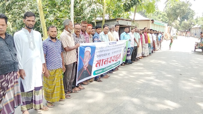 শেরপুরের শ্রীবরদীতে ইউপি চেয়ারম্যান ফখরুজ্জামানের অপসারণের দাবীতে মানববন্ধন